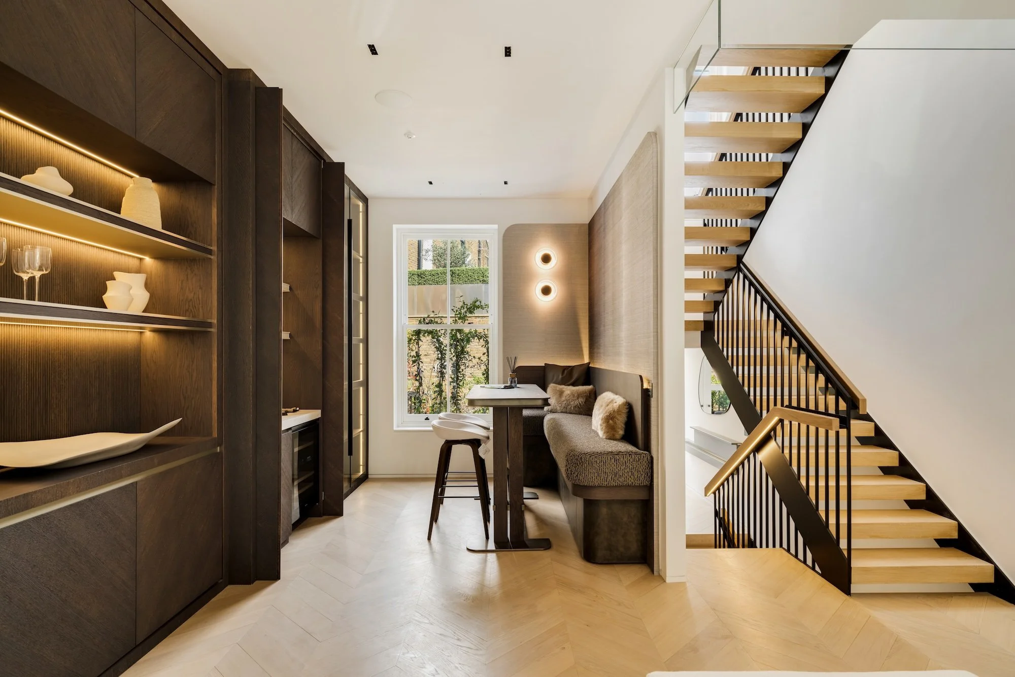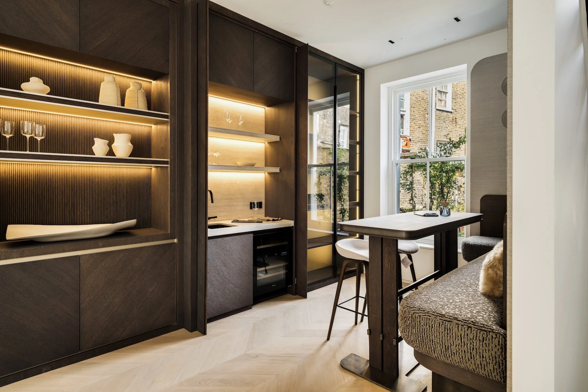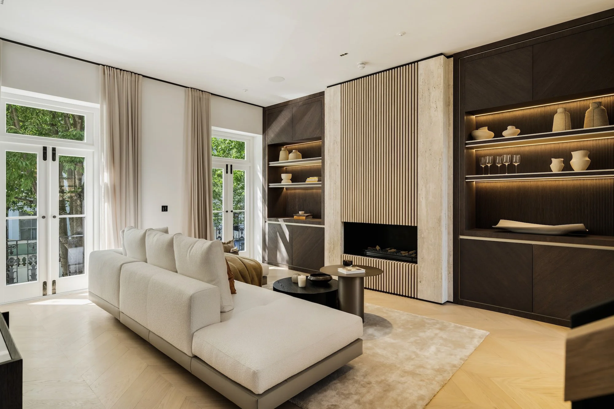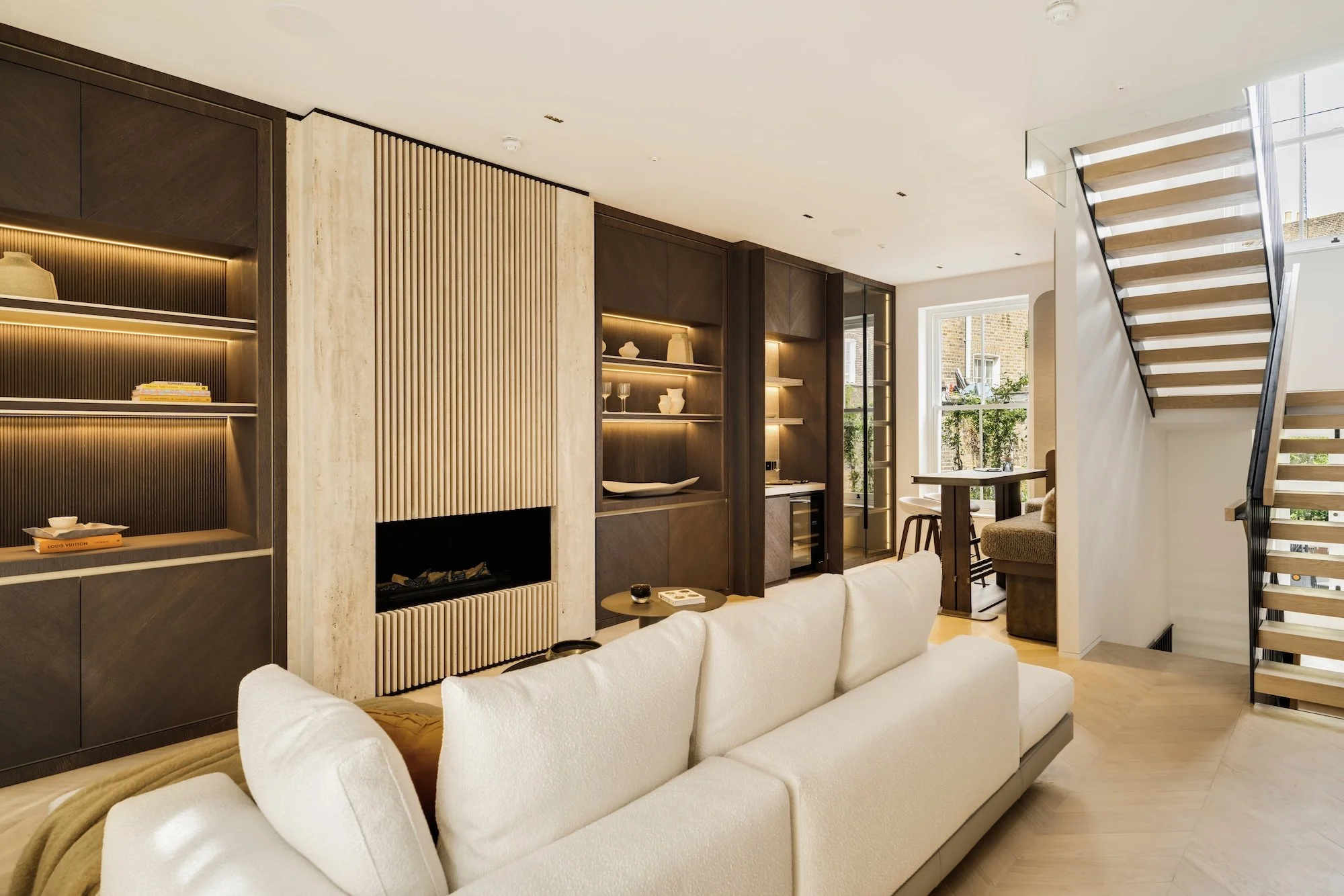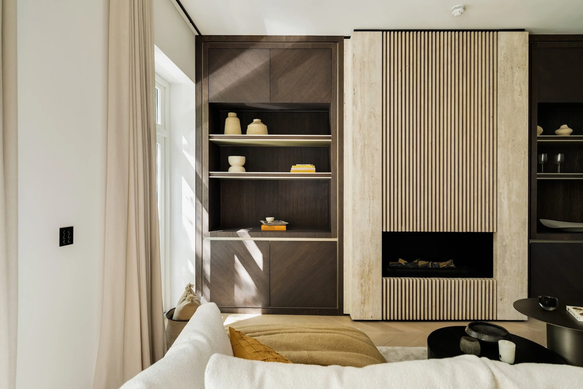 A variety of interesting and luxurious materials were combined to create this large wall of living space joinery. Brushed smoked oak veneers, with fluted solid smoked oak, metalic trims, stone and glass. The resulting piece is large but also feels light, layered and textured.